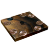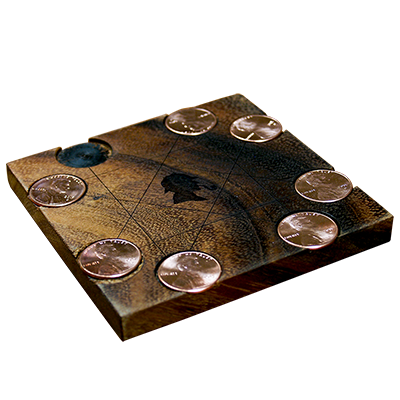 This is a nice wooden puzzle is custom designed. It measures 3.75 x 3.75 inches and fits into the palm of your hand. The seven pennies are included. The object is to start on a vacant circle and to move it once along a connecting line to another empty circle. This must be done with all seven pennies leaving the eighth hole vacant. Most people can do four or five pennies, but doing all seven takes a knack. This makes a great gift. Limited supply.