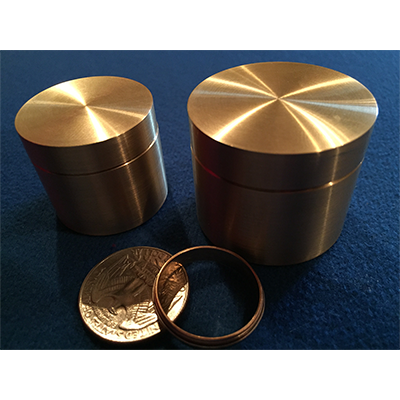 They are two small brass boxes, perfectly built, one fits inside the other. You can make a borrowed ring, a signed coin or one small paper with a prediction appear inside the boxes. They work like a bill tube system and look incredible. Besides, the set includes a hankerchief to vanish a borrowed ring and you get a link where everything is explained. In this link you have a great routine using this nest of boxes, plus another 60 different routines with Tango products.