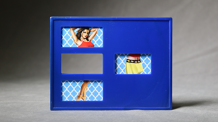 Effect: The performer shows a plastic frame having four windows. Three of these windows are on one side of the frame forming a vertical column while the fourth one is at the middle of the other side. Next, the performer shows the card and inserts it in the frame. The card is clearly visible through three windows on one side of the frame. The Performer mimes to cut the card into three pieces and then suddenly slides the middle of the cards towards the single window on the other side of the frame. Now it is seen that the card is in three pieces - the the middle section of the card is on one side and the upper and lower section are on the other side! After a slight pause the performer slides the middle section of the card back to its original position, between the other two pieces, and takes out the card from the frame. The card is completely restored. The performer has performed the most powerful stage illusion in miniature form, close-up viewers are thoroughly baffled!