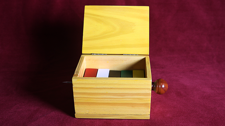 The magician asks a spectator to call out one of the colors of blocks. Let's say blue is called out; the magician places the blocks inside the box in any order and closes the lid. Next he shows a long, thin metal rod and pushes it through the holes on the side walls of the box threading through the holes of the colored blocks. The magician gives the box a shake and the spectator's selected color block, blue drops out on the table. The magician opens the box to the audience and shows that the four other blocks are still trapped on the metal rod.