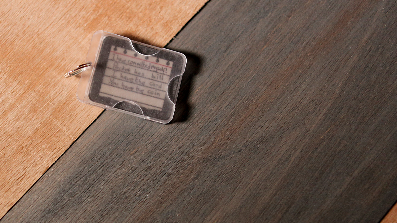 Hanging from your keychain is a clear photo holder. Locked inside is a scrap of paper with a secret message. Your spectator holds the keychain message in her hands.