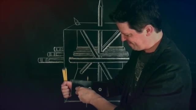 He next removes the pencils and shows that there's barely enough room for his arm to fit inside. He tells them the real tricky part of the test is putting the pencils back in while his arm is still there...