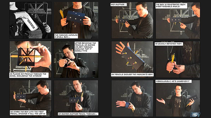 One-by-one, six sharpened pencils are jabbed through the box, mysteriously or painfully penetrating the magician's arm. With each pencil, he demonstrates his resolve at becoming a magician. After the last improbable pencil is inserted, he reveals that he passed the test. The pencils are removed and his arm is shown to be unharmed.