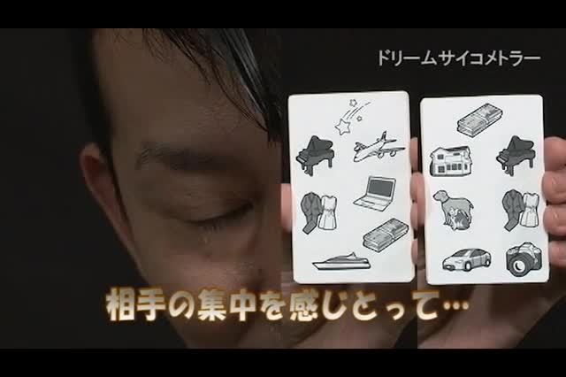 The magician displays a card with fourteen different items printed on it and asks a spectator to think of one of the items that he strongly desires. Then the magician brings out four different cards all of which have some of the same items printed on them. Without looking at the cards the magician asks the spectator to look and see if the item he's selected is on the cards. The spectator is then asked to concentrate strongly on the item he's chosen. During this time, the magician who never saw the cards, reads the spectator's mind and correctly divines the chosen item.