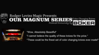 These pearl white and brown jigged bone magicians' knives are possibly the finest set of color changing knives ever produced. They were custom designed for magicians and the quality is built to last. Two years of working on this new design and with the help and expertise of The Boker Knife Company, Rodger Lovins Magic Presents feels they have built their finest knives to date.