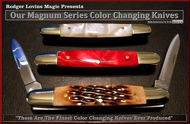 Each knife has two identical "highly polished" stainless steel blades. They are fitted with real nickel silver bolsters, and solid brass liners and pins. All three knives have Rodger Lovins Magic Presents' "trade marked" deep etched thumb pulls located on each side of the blades for an extra added subtlety. The slightly rounded shape makes the "paddle move" easy to perform and very deceptive. The size is 3 inches long, by 1/2- inch-wide, so they don't take up too much valuable pocket space. Having the deep jigging into the bone handle makes it very easy to tell one side from the other while in your pocket. These are not cheap dollar store knives. The machine work is precise in every detail and the handles are absolutely beautiful! The matching pearl white ungimmicked knife is also included in the set. As an extra added bonus, a second gimmicked pearl white and bright pearl red knife is included for those of you who do a three-knife routine and want a second color change. You get all three knives for one great price. Please make sure to order yours today before they all vanish!