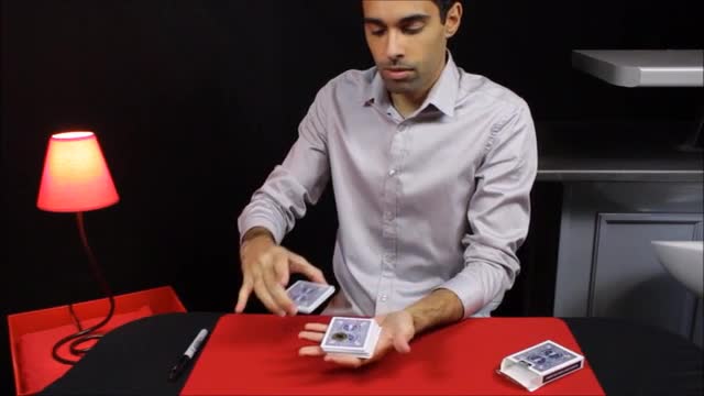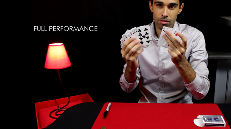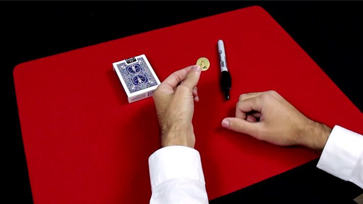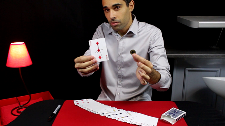 A selected and signed card is lost in the middle of the deck. You put all the cards back in the box and you borrow a coin from your audience. The coin is signed by a spectator and you make the coin magically disappear. The signed coin reappears instantly in the box and in the middle of the deck on the signed card! Audiences are amazed!