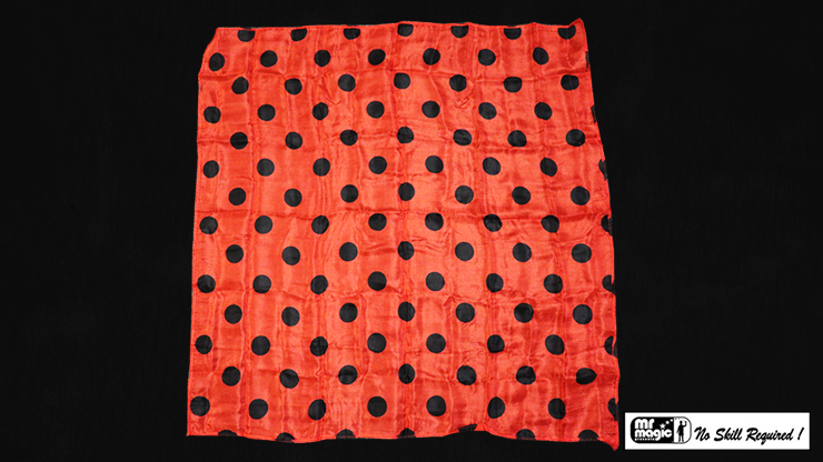 A production silk of all red with black polka dots, measuring 21 inches by 21 inches. When folded, this fine silk takes up very little space.