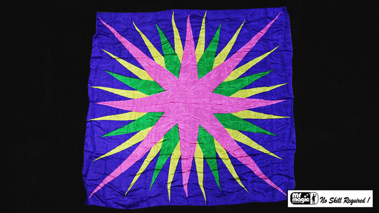 A production silk with a blue background and the image of a large yellow, green, and pink star burst, measuring 36 inches by 36 inches. When folded, this fine silk takes up very little space.
