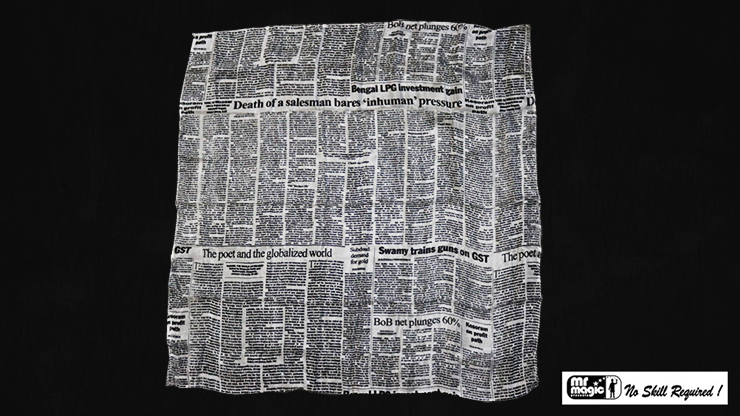 A production silk resembling a newspaper, measuring 21 inches by 21 inches. When folded, this fine silk takes up very little space.