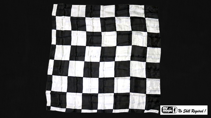 A fine made production silk measuring 21 inches in length by 21 inches wide, decorated with a black and white chess board pattern. This silk, when folded, occupies very little space. Magically produce from any production apparatus like 'Mirror Box,' 'Square And Circle,' etc. This silk is provided in a zig-zag fold, ready to use. It really looks beautiful - your audience will love this!