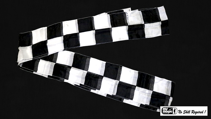 A beautiful streamer made of fine silk. This can be used in many ways, including effects in which two hankies appear to blend together and become one. This creates a wonderful transformation which never fails to surprise audiences. This particular streamer is 6 inches by 18 feet, and is decorated in a black and white chessboard pattern.