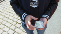 The magician pulls a bill out of his wallet and then passes the empty wallet to the spectator.