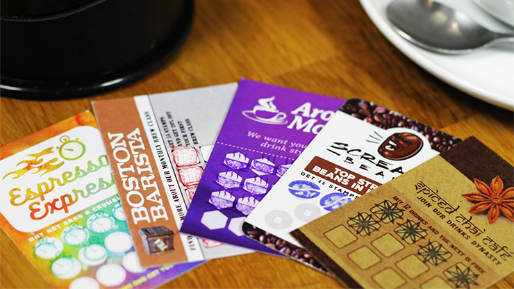 The key to any invisible prop is to make it appear like the genuine article. For this reason, the Cool Beans cards have been printed using different card stock and styles, as you would expect to get from five unconnected coffee establishments. Each card has been hand stamped with a customized stamp for each card, adding to the apparent authenticity of them.