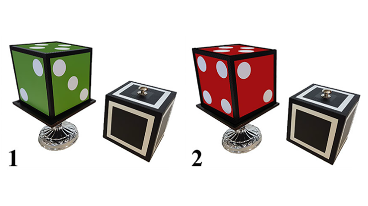Great VISUAL magic! Show a giant die resting on a pedestal. Place a cover over the die, remove the cover, and the die has changed color! Show the inside of the cover to be empty. Repeat this several times, each time magically changing the die to another color! When the cover is placed and removed the final time, it is found that the large die has turned into 8 smaller dice, which you can stack into piles. The product stands at 12 inches tall.