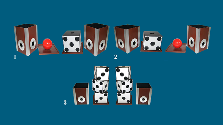 The magician displays two square tubes and shows that inside one there is a giant die, and inside the other a large ball. In a fun filled routine, the die and ball magically change places various times. Then, for an amazing climax, the die becomes 2 dice, then 3, then 4... until at the end there are 6 large dice! And the large ball will have completely vanished. A fun and magical feast for the eyes!