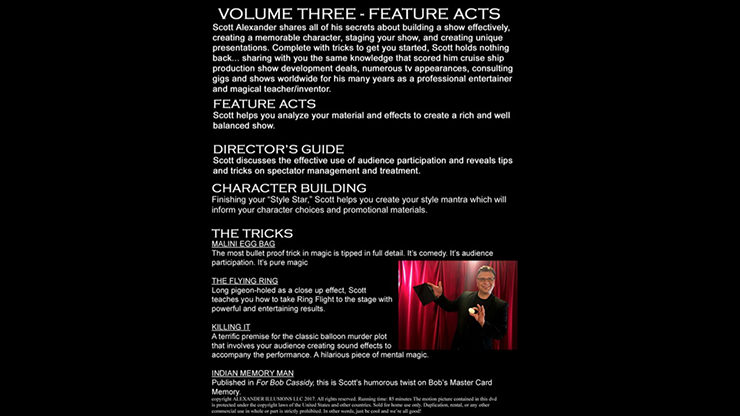 In this third of five volumes, Scott teaches you how to analyze your effects to create a rich and well-rounded show. Revealed in this volume on the Director's Guide section are tips on the effective use of audience participation and spectator management. In the Character Development portion, Scott wraps up the process of helping you to hone in on your character using the "Style Star." He gives you examples of how to turn the star you create into an effective marketing strategy.