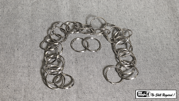 A puzzle effect where you show linked rings formed into a double chain. The ring from the very top slides down as if on a ladder, and drops onto the table. Demonstrate this a couple of times, but on the third attempt, the ring rolls down and then disappears right in front of your spectator's eyes. Make the rings disappear or drop into your palm as many times as you wish.