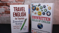 The set consists of one 263-page 6" x 9" book and one 5.5" x 8.5" book in the form of an English language guide for travelers. This provides the perfect motivation for the book content, layout, and format.