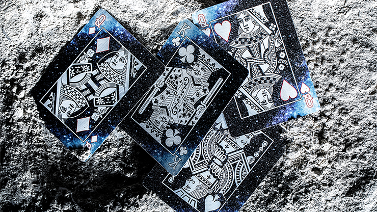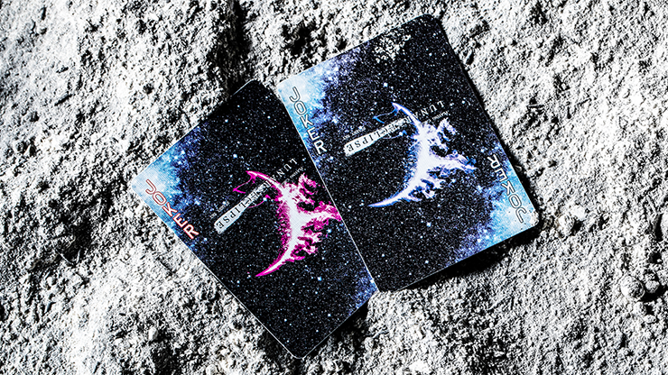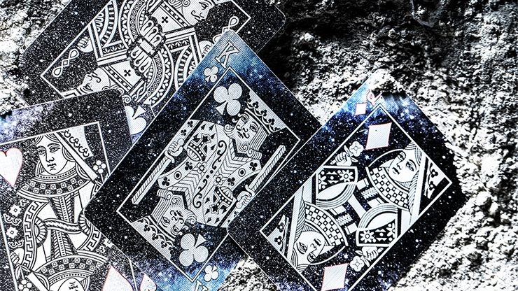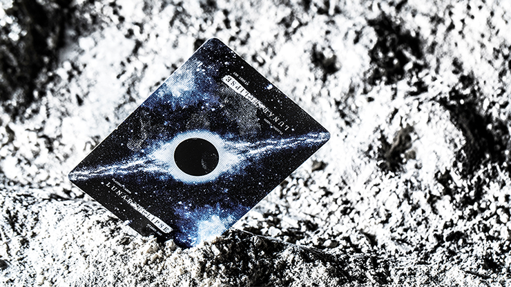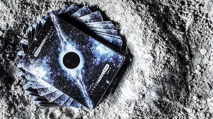 Bicycle Lunar Eclipse Playing Cards, just as its name suggests, features the lunar eclipse as its spectacular element. The overall positioning of the lunar cycle is in a dull black style -- the deep nocturnal sky on the tuck, the pure cold moon, the vast galactic sky, all showing the faint breath of the universe. The card back depicts the flickering moon placed in the exquisite and silky black, starry night sky. As a result of the moon being surrounded by a nebula ring, there is a diagonal line on the card back.