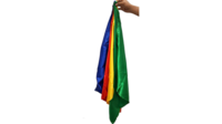 The magician walks onstage with several large, brightly colored silks hanging from his hand. Each is a different color. He removes a silk to show that it is flat, and places it back in his hand on display. He repeats this action for each silk.