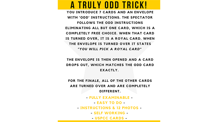 You introduce 7 cards and an envelope with 'ODD' instructions. The spectator follows the ODD instructions eliminating all but one card, which is a completely free choice. When that card is turned over, it is a royal card. When the envelope is turned over, it states: