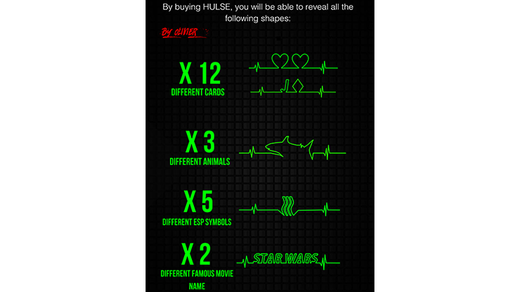 Imagine finding the spectator's card using their heartbeat! With HULSE, you will be able to reveal several different shapes, using your own phone. Have your spectator select a card, or think about an ESP symbol, an animal, etc. Plug a headset into your phone. Now explain that the left earphone is designed to listen to heartbeats, and the right one to actually feel the beats. You open the heart monitor on your phone and you start taking your own pulse. You can see the beats on the screen. Then take the spectator's pulse, and finally, ask them to think about their card, animal, ESP symbol, etc. Suddenly, between the pulses on your screen appears a drawing of the spectator's selection or thoughts!