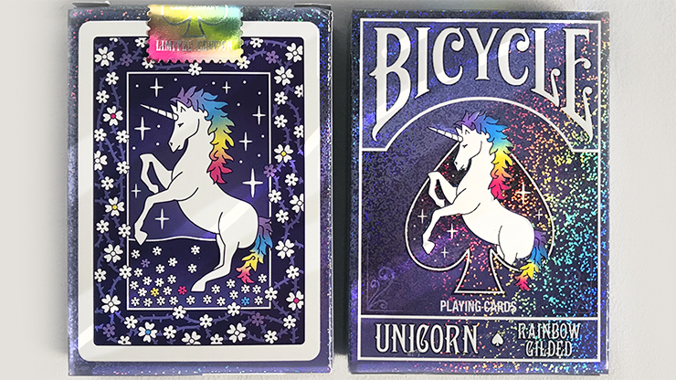 Limited edition Bicycle® Rainbow Gilded Unicorn Playing Cards was made exclusively for MAGIC Live! 2018. This limited version features an embossed glitter tuck with a surprise rainbow print on the inside, beautiful silver/rainbow gilded edges and a foil closure seal.