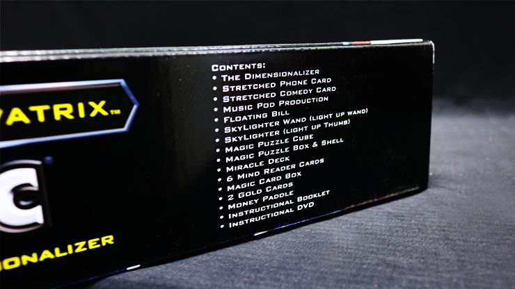 - The Dimensionalizer: A unique, stage-quality prop that flattens any item put into it! (For use with included stretched phone card and stretched comedy card.)