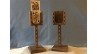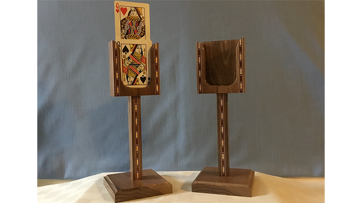 The Karpinski Houlette is a utility card stand which can be used for displays of decks in a variety of effects, and which has been crafted with the components to perform a multiple card rise. The Houlette is a vertical stand for playing cards which serves to isolate the deck from apparent manipulation and to create an elegant visual display. The upright nature of the display makes it ideal for parlor and small stage conditions. It has been designed to fit both standard poker-sized cards and bridge-sized cards (the poker-sized option fills the display chamber more fully than smaller cards).