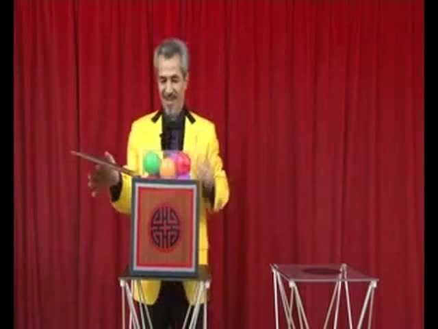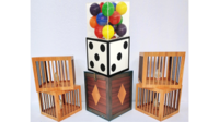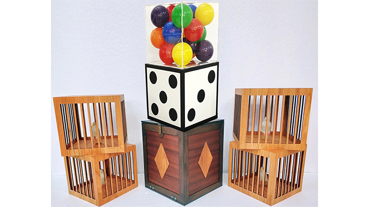 A large die is shown and then placed into a cube. This cube is then closed. When opened, in place of the die is a crystal casket full of colored balls! This is then placed back inside the cube and almost instantly changes a cage, complete with a rubber dove inside. Magically and amazingly, you individually remove three more cages with rubber doves inside each one!