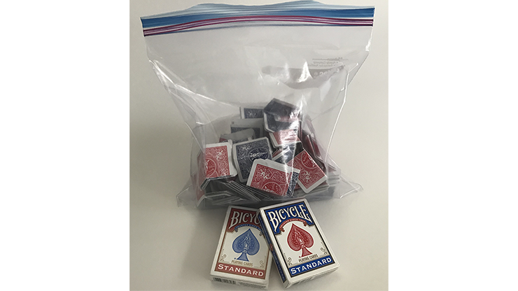 The performer now produces a gallon size Ziploc freezer bag that contains dozens of folded playing cards. The performer explains that there are two complete decks, including Jokers, contained in the bag, each card having been folded into quarters. The bag is handed out for a very thorough examination. It is found to be exactly as advertised (because it is!).
