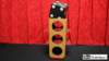 A large wooden square tube is standing on a slightly raised wooden base. The tube has three large holes on the front as well as on the back wall, so that interior of the tube is clearly visible to the audience. Further, on the two side walls, at a distance apart, there are two pairs of slots.
