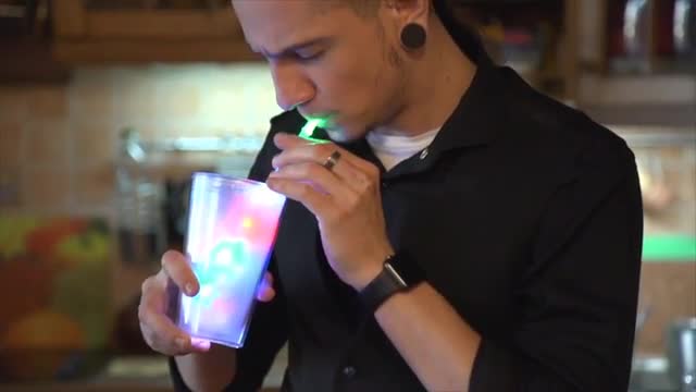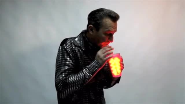 With your empty hand, you catch colored lights (or only red lights) and throw them in a glass, fill the glass with lights, and then using a straw, you can interact with the lights and drink! After that, the lights will glow in your mouth!