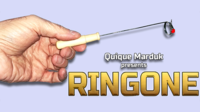 The ring is taken from the spectator on a small hook and lowered into one of the glasses. The magician's hands are shown to be clearly empty.
