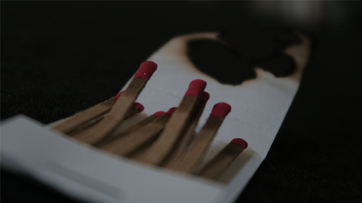 The cover of the matchbook is lit on fire, quickly becoming engulfed in the flame, but blown out before completely burning away.