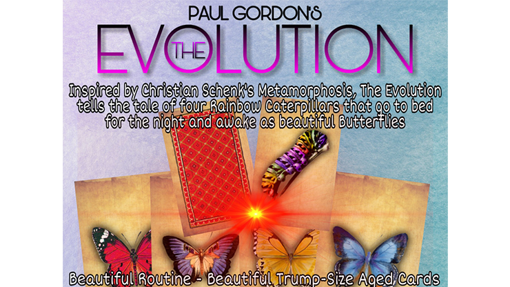 Inspired by Christian Schenk's Metamorphosis, Evolution is simply beautiful and unusual. Beautiful trick, beautiful artwork and beautiful aged trump-sized cards. Four rainbow caterpillars turn over and go to bed one by one. When they awake, they are stunning butterflies!