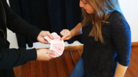You ask the spectator to choose and sign any card in the deck. Then you loose it in the deck, the cards are mixed. Suddenly the cards in your hands are transformed into a box. When you open the box you can see that all the cards appears into the box, and then with a magic puff all cards disappear, all except by one their signed selection!