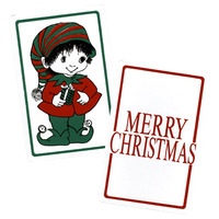 Three jumbo (6.5" by 10.5") cards are shown to the audience. Two of the cards show pictures of smiling elves and on the third is a picture of Santa Claus. The three cards are squared up and placed inside an envelope. One of the elf cards is removed and shown on both sides and placed aside. The second elf card is also removed and shown on both sides. After suitable byplay, the last card is also removed and the envelope shown empty. One side says Merry Christmas and when the magician turns it around, the other side says Ho Ho Ho! - where did Santa go?!