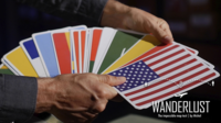 The magician shows a world map and a jumbo deck with different flags printed on them.