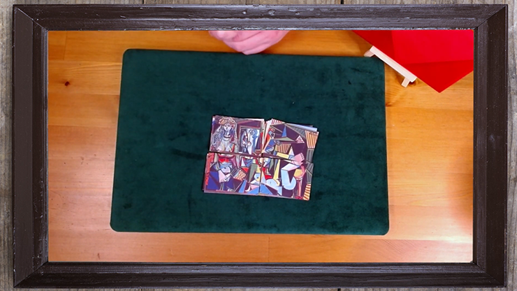 The spectator shuffles them around, whilst you leave a mysterious red envelope on a cute little easel, in full view.