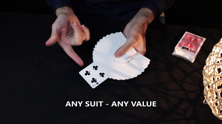 A deck of cards is presented as a prediction at the beginning. Then the magician gives the spectator an imaginary deck from which the spectator will choose a card. Once the card is chosen, the magician takes the deck out of the case and reveals that the card chosen by the spectator is the only card face up in the deck. In addition, the card has a different color back than the other cards. And even more impressive, all the other cards in the deck have blank faces!