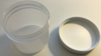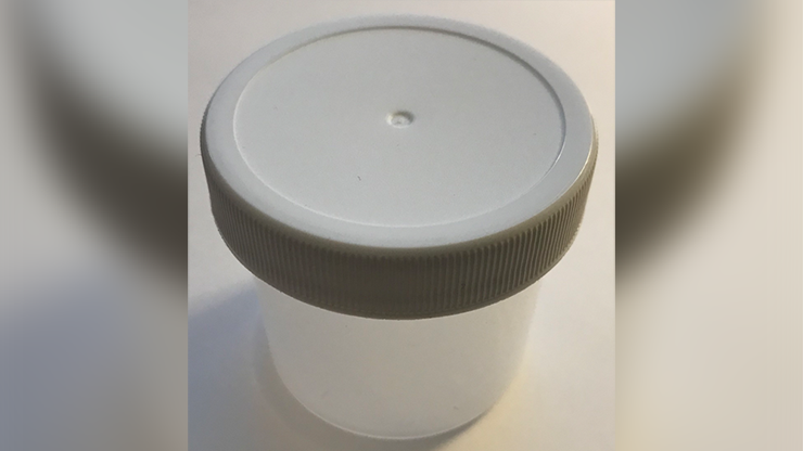 The coin is placed into a small translucent plastic jar and sealed with a screw top lid.