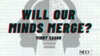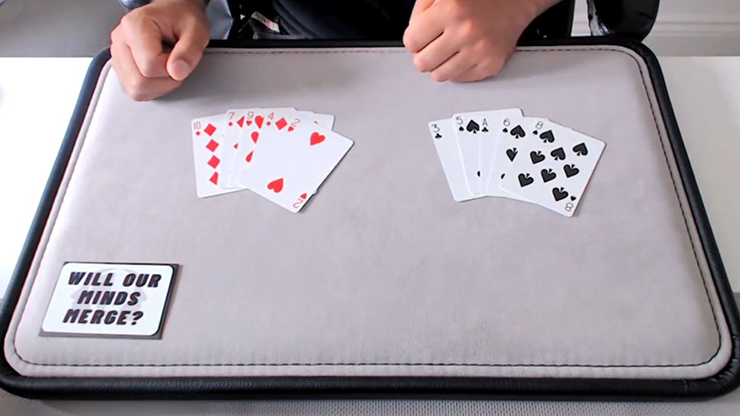 A prediction card is displayed with the words 'Will Our Minds Merge', and the magician instructs the spectator to select either pile to spell out the words, starting with 'Will'.