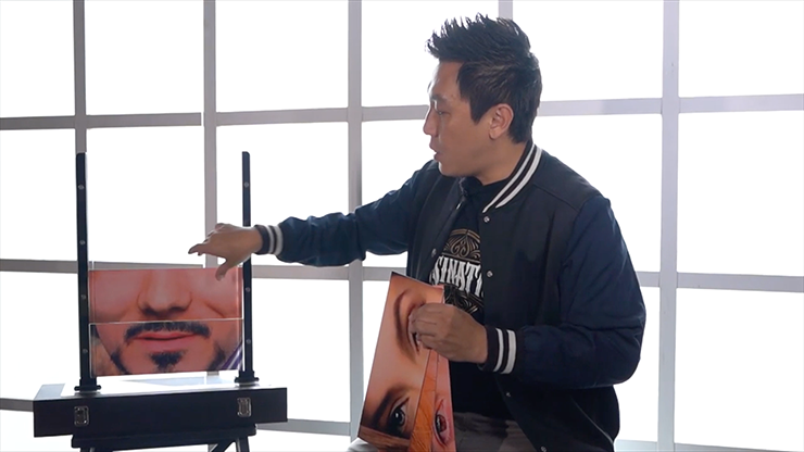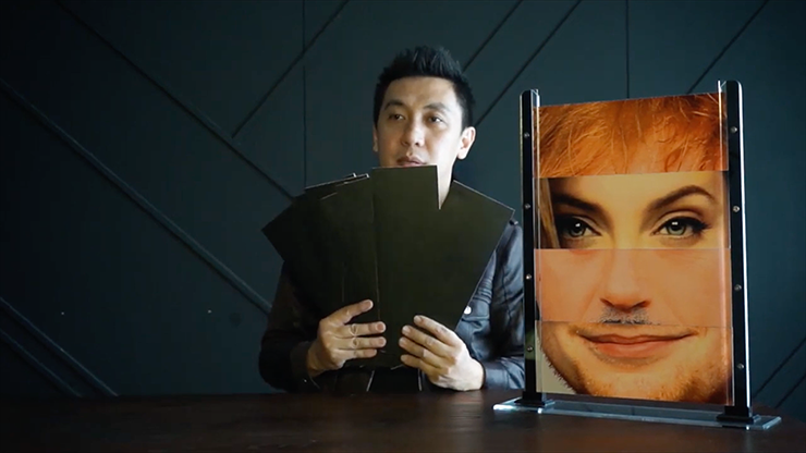 3 celebrity photos each cut into 4 parts: forehead, eyes, nose and mouth. So there are 3 sets of foreheads, 3 sets of eyes, 3 sets of noses, and 3 sets of mouths. The spectator then randomly chooses a part of the face from each set. There is less than a 2 percent chance that it will be a correct set. The result, of course a messy-mixed set that looks funny. But what they don't know, that the messed up face have a secret image behind it, which compose a whole new complete face, whilst the rest of the unselected parts are blank on the back.