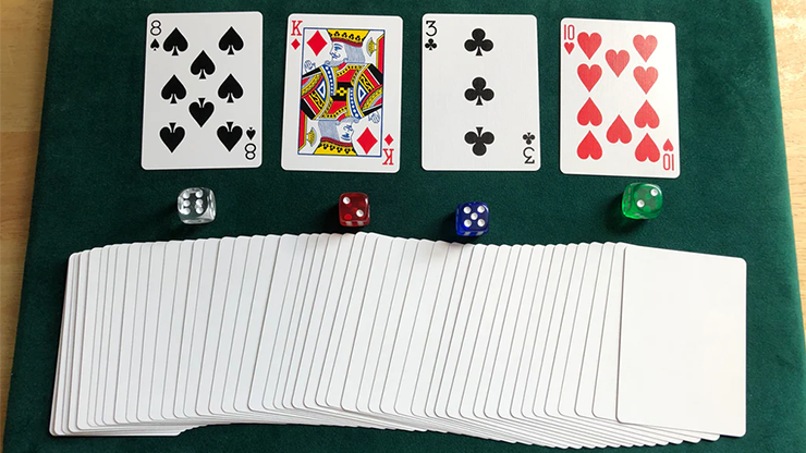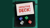 Package includes full instructions, bonus method using the same props, special Bicycle deck, specially printed 'Defective Deck' prediction card, and four translucent dice, all contained in a cloth drawstring bag.