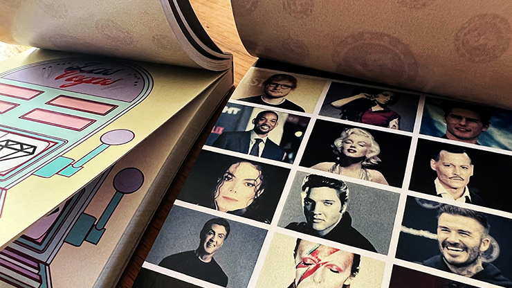 Flick through the book and show a plethora of different Las Vegas hotel talked about on each individual page - they really are all different! Get your spectator to lift up any random page and remember the hotel... not just the hotel but a playing card, a dice value or maybe even a roulette number, all displayed in the page graphics. You are then able to predict or reveal all the information before going one step further and revealing a word on the page!