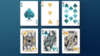 The faces of the playing cards have been modified from the classic colors. The originally black pips of the Spades and Clubs have been filled with colors corresponding to the backs of the playing cards. There are rich layers of red, blue, and green, in the pips, but also hints of gold color. The Hearts and Diamonds are now gold in color to ease gameplay and magic.