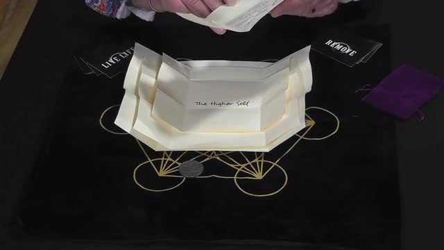 From within the final, smallest packet, the performer removes and displays a pewter oracle token, which they explain is used to understand the positive and negative aspects of our lives.
