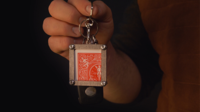 Then the spectator chooses a card and signs it. This card is put back into the deck and then the deck is shuffled. Perform your favorite ambitious card routines or impossible location card and to finish with a kicker ending effect, pay attention to the keychain in the spectator's hand since the beginning of the trick, take it off the screws and take the folded card inside it-here, unfold it, this is the spectator's card previously signed! an impossible because it was in sight imprisoned since the beginning of the trick even before the spectator chooses and signs his card.